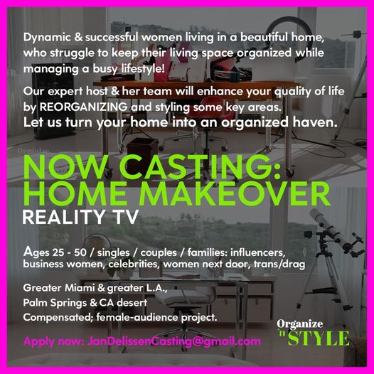 Apply now and let ‘Organize ‘n Style’ turn your home into an organized haven. Locations: Greater Miami, Greater Los Angeles, the CA desert: incl. Palm Springs, Coachella Valley, and Joshua Tree. Please send email to: JanDelissenCasting@gmail.com to learn about the application process.