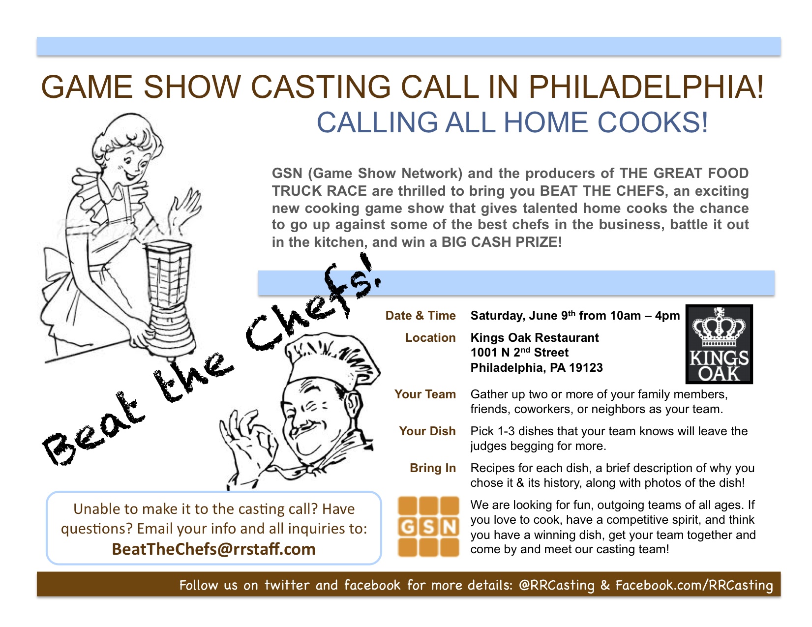 We are looking for fun, outgoing teams of all ages. If you love to cook, have a competitive spirit, and think you have a winning dish, email us at BeatTheChefs@rrstaff.com. Please include your name, age, contact info, photo, two proposed teammates (and their photos), a description of your culinary background and your signature dish! Put the CITY/STATE where you live in the subject line for priority!