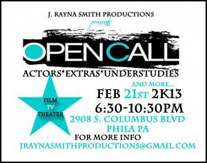 JRS Productions will be holding a casting on February 21, 2013 at 6:30pm-10:30pm (ONLY), For three up and coming productions that will be featured in the 2013 DC Black Theater Festival in Washington, DC. The Festival will be held from June 21-30th, you must be available during this time frame. We are casting for both men and women. We are also looking to cast additional up and coming productions in genres of Film, TV and Webseries. Please submit headshot and resume to jraynasmithproductions@gmail.com. There will be audition sides available on site, however we encourage you to have a 1-2 minute monologue prepared upon request.