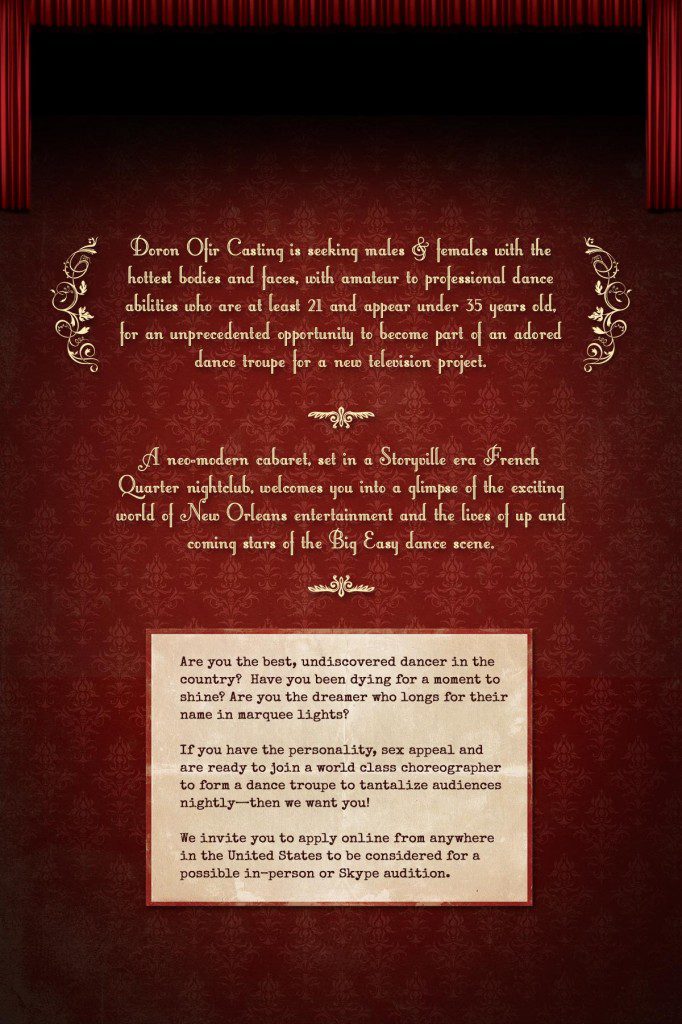 The show is described as “”A neo-modern cabaret, set in a Storyville era French Quarter nightclub, welcomes you into a glimpse of the exciting world of New Orleans entertainment and the lives of up and coming stars of the Big Easy dance scene”