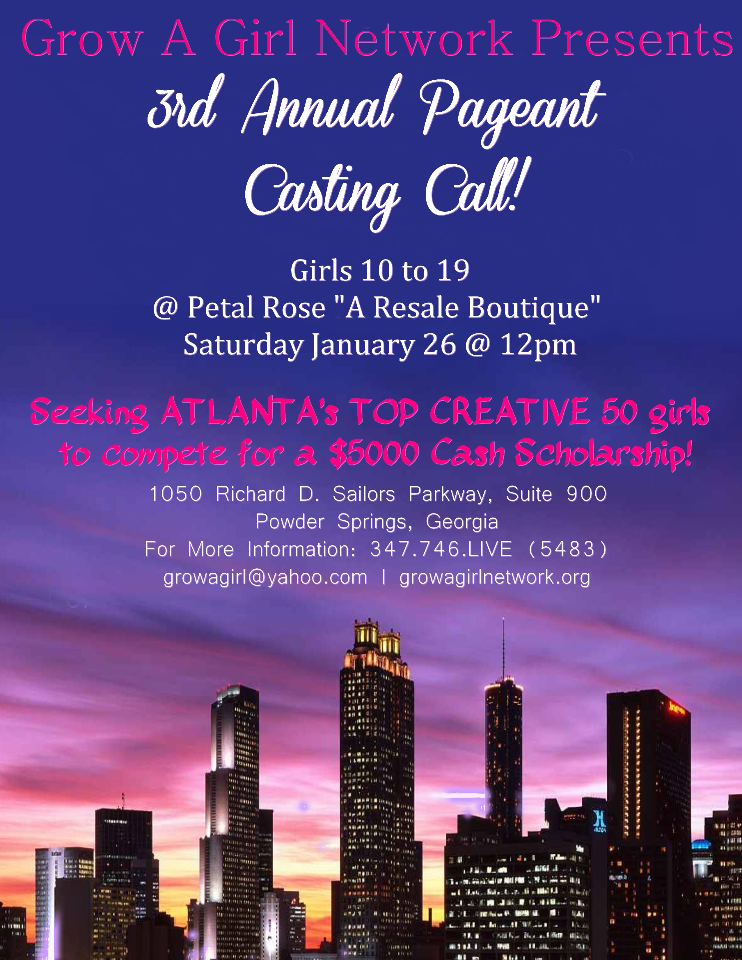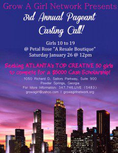 CALLING ALL GIRLS AGES 10 TO 19. GROW A GIRL NETWORK, INC: ATLANTA WILL BE HOSTING A PAGEANT CASTING CALL FOR THEIR $5000 SCHOLARSHIP PAGEANT ON JANUARY 26, 2013 AT PETALS ROSE RESALE BOUTIQUE LOCATED AT 1050 RICHARD D. SAILORS PARKWAY SUITE 900 IN POWDER SPRINGS, GA @ 12PM. FOR MORE INFORMATION, PLEASE CALL 347.746.5483 AND VISIT OUR WEBSITE AT WWW.GROWAGIRLNETWORK.ORG