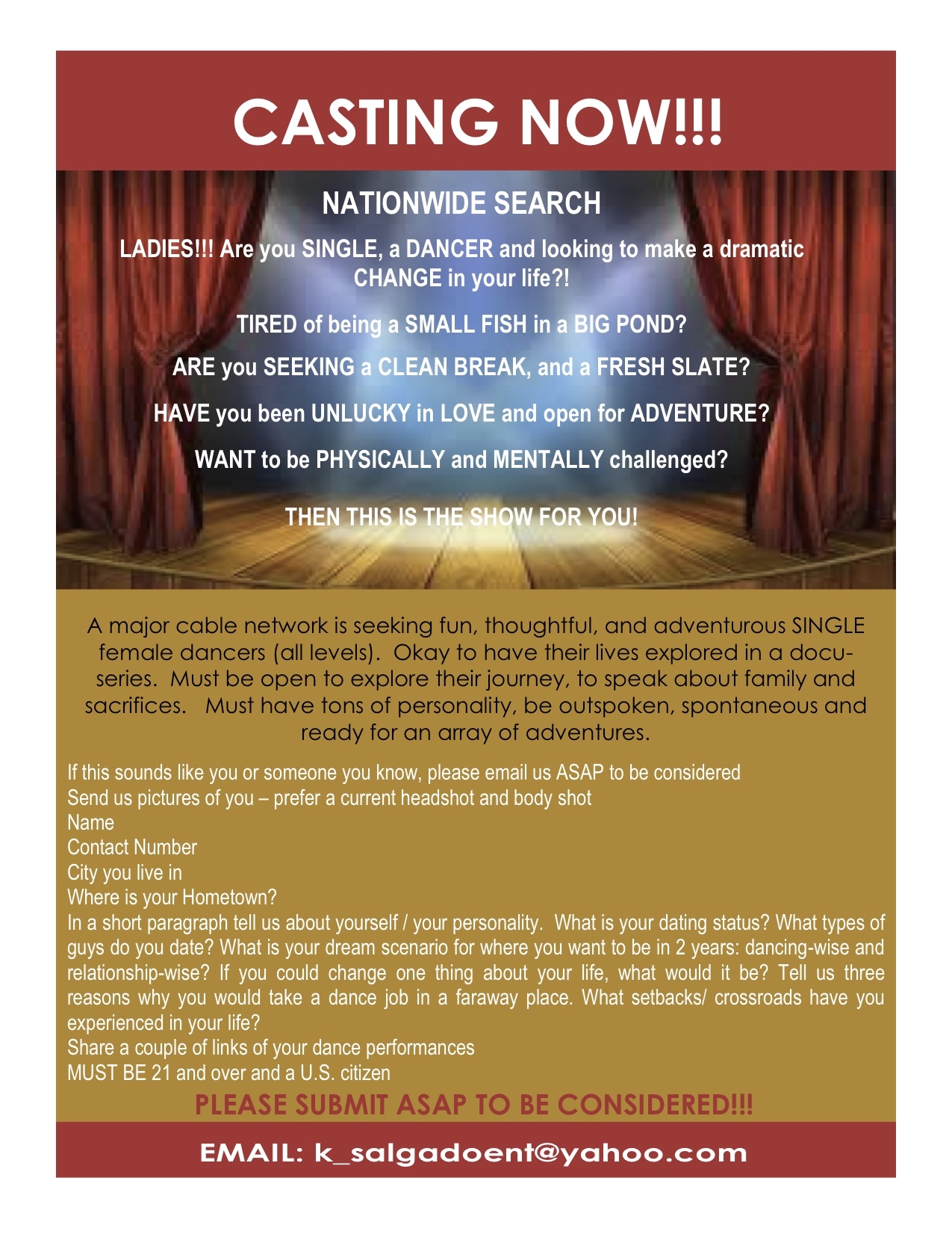 Don’t have to be incredible dancers, just really able to follow choreography and wants to be in the spotlight! Must be fun, outgoing, upbeat, free-spirited, spontaneous and single and ready for some fun and adventure! Must be fun, outgoing, upbeat, free-spirited, spontaneous and single and ready for an adventure! Great all-around performers highly recommended.