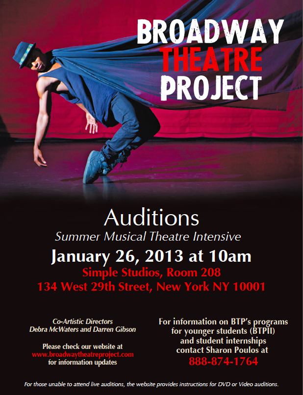 Dance Auditions – Broadway Theater Project By erica | January 24, 2013 0 Comment Where: NEW YORK NY This casting notice was posted on auditionsfree.comType: DanceNew YorkSaturday, January 26, 2013 10:00amSimple Studios Room 208134 West 29th Street New York, NY 100012013 Dance AuditionsRelated Auditions Ujima Dance Theater in Philadelphia Dance AuditionsAudtions for new dance company Ujima Dance Theater Location: Philadelphia.… New York Dance AuditionsContemporary Audition/Master Class Casting notice posted on auditionsfree.com, casting location:… New York Musical Theater AuditionsThe Fulton Theatre in Lancaster PA is holding an open… Dance Auditions | ChicagoCERQUA RIVERA DANCE THEATRE - Dancers can try out for…