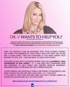 FEATURED ON MULTIPLE TELEVISION SHOWS, SUCH AS LA SHRINKS & REAL HOUSEWIVES OF NEW JERSEY, DR. V HAS USED HER TRADEMARK SASS AND KINDNESS TO HELP FAMILY AND FRIENDS RESOLVE SEEMINGLY INSURMOUNTABLE PROBLEMS AND FIND COMMON GROUND.