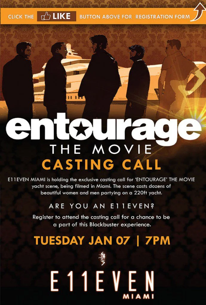 Register to attend the exclusive casting call for ‘Entourage’ The Movie yacht scene, being held at E11EVEN MIAMI on January 7th, 2014 @ 7pm Click here to register. http://statictab.com/scjmim5