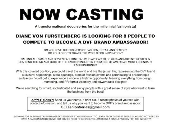 The new fashion show will follow eight “smart and driven fashionistas who appear to be 20-25 . The show will film for around 8 weeks sometime in the spring of 2014. The show is looking for people with a great sense of style. If you are the next “Millennial Fashionista” check out the casting flyer to apply today! You will need to send a short bio along with 3 photos to the email address listed above.