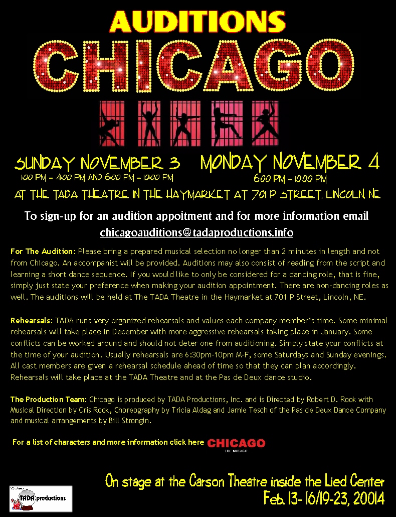 The TADA Theater in Lincoln Nebraska is putting together a production of ‘Chicago The Musical” and is holding theater auditions on Sunday from 1 p.m. to 4 p.m. and Monday from 6 to 10 p.m. at TADA Theatre 70 1 P St.