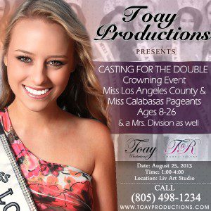 Searching for contestants for Miss Los Angeles County & Miss Calabasas: ages ranging from ages 8 — 13, Teen 14 — 18, Miss 18 — 26 and Mrs. contestants as well. Win $1000 cash prize, addditional $300 for spokesmodel winner, gift certificates, make-up, hair stylist, gift certificates, national exposure!! This is a preliminary pageant that leads to Miss California USA, Miss California Teen USA & Mrs. California United States. Seeking Confident women who are talented and not afraid to have an opinion. A woman who is not just stunning and beautiful; but someone who breaks the barriers, believes in charity, loves people and is not judgmental of others. She must be exceptional in every way and a good sense of self and showmanship. A woman that is respected, educated and youthful with strong insight to offer audiences of all ages. Seeking contestants that are also ready to be a model and ready for red carpet events, fashion shows and being a spokesmodel for various designers. All interested and ready please email today. Casting and Reality TV taping on August 25 at Liv Art Dance Studio in Hollywood, CA. Call to schedule your audition time