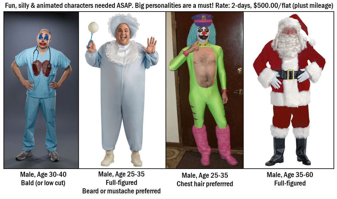 ROCKSO CLOWN – Male, age 25-35, average build and chest hair is preferred (but not required