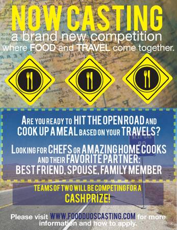 Get ready to hit the road and put your culinary skills to the test as you travel from place to place and create dishes based on those travels. Now casting Chefs, home cooks and foodies and their partners because this show is looking for teams of two! Teams chosen will compete on the road and possibly win some cash!