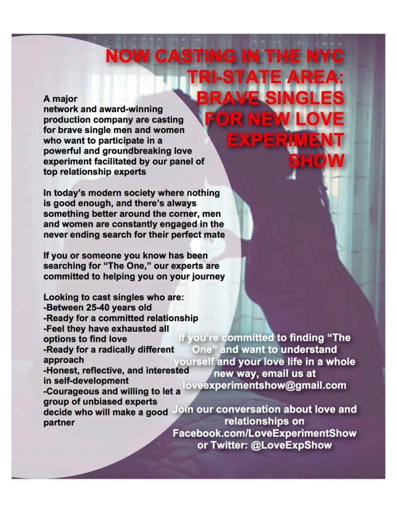 A TV Network is looking for “Brave” single men and women in the New York Tri-State area to participate in a “Love Experiment”. Are you still searching for your perfect match?