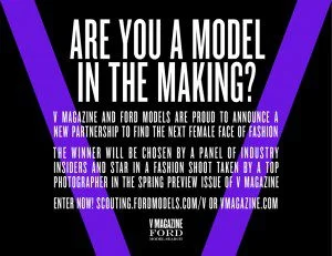 Ford Models and V Magazine have teamed up for a nationwide model search going on now. ARE YOU THE NEXT FEMALE FACE OF FASHION? You can now submit your modeling application online to find out.