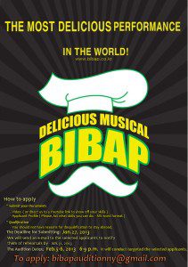 The famous Korean musical ‘Bibap’ is looking for talented entertainers. They must possess intermediate to advance skills in the following techniques and/or styles: Hip-hop, B-boying, Beatboxing, and/or Acrobatics. Bibap is not only playing in Korea but is also going into the overseas market. It would be a huge opportunity for you guys. Here is your chance to become a famous star in a musical.