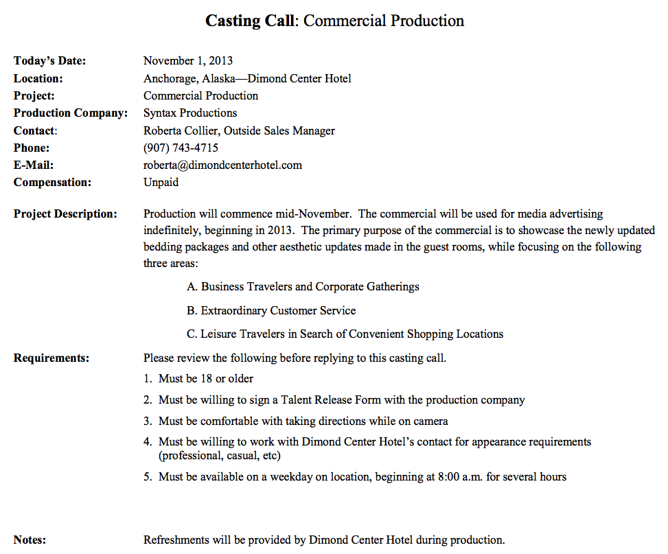 The Hotel released the following casting call: