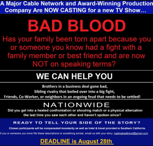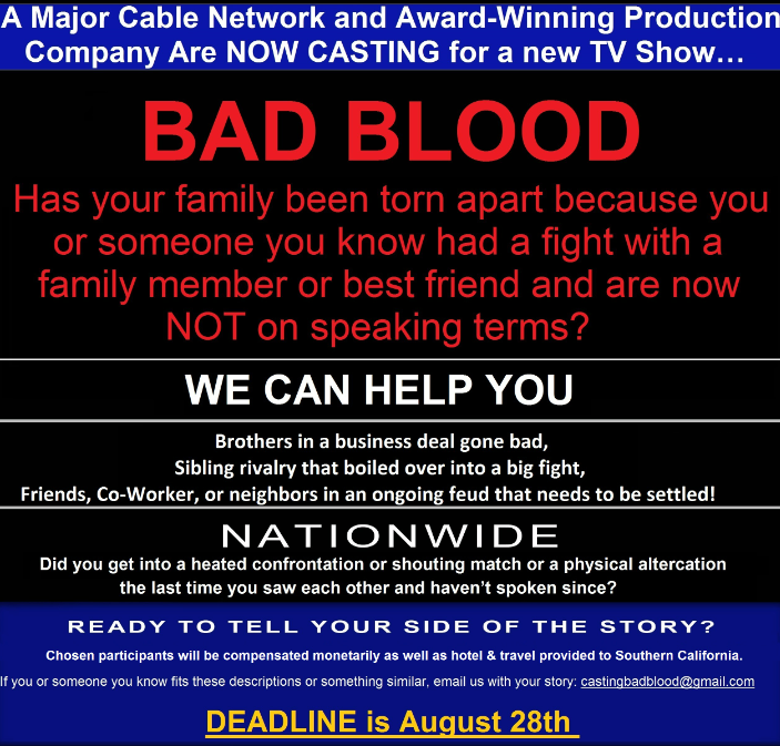 Currently casting feuding friends, family, neighbors, etc. Has your life been turned upside down because of a rift with a family member, friend, co-worker, neighbor or ex. Are you no longer on speaking terms? Was there a shouting match or physical altercation?