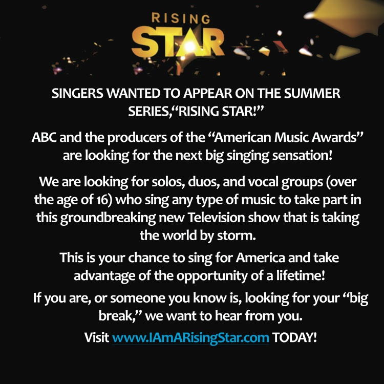 ABC’s newest singing competition, “Rising Star” will be holding open auditions next week in Atlanta, then they will head to Chicago, Nashville, Los Angeles, New York and Boston. Atlanta residents can see below for information, all other cities including online auditions nationwide can visit their site for more info. (See casting flyer)