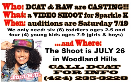 The DCat Music Company is casting 1-3 year olds. The artist is a 12 year old recording artist named Sparkle K. The video shoot is Saturday, July 26th at 9am.