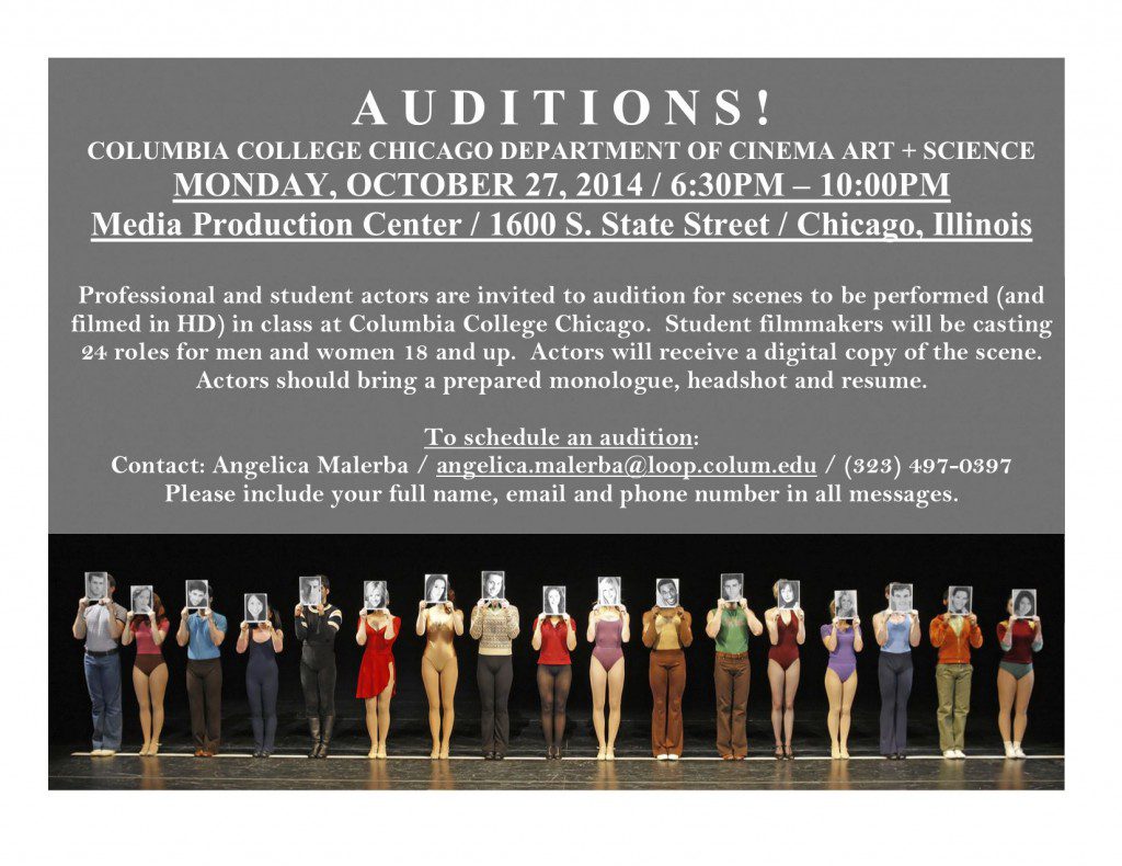 Professional and student actors are invited to audition for scenes to be performed (and filmed in HD) in class at Columbia College Chicago. Student filmmakers will be casting 24 roles for men and women 18 and up. Actors will receive a digital copy of the scene. Actors should bring a prepared monologue, head shot and resume.