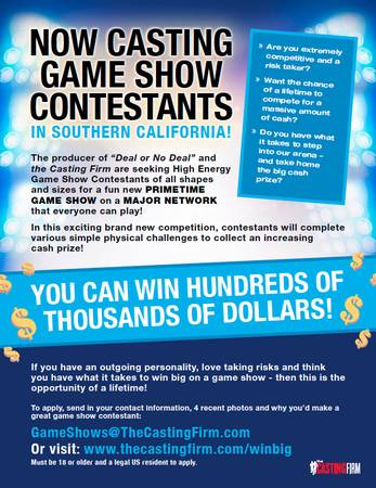 Are you a SoCal local who would like the chance to play for cash and prizes on a TV show? Here is a shot! The new show will give contestants the chance to not just win some money, bit win lots of money… hundreds of thousands! The new show comes from the producers of “Deal or no Deal” and will be produced for a major television network. The new show is looking for contestants, 18+, from all walks of life, of all shapes and sizes. The new TV competition will involve doing simple challenges to collect a cash prize at the end.