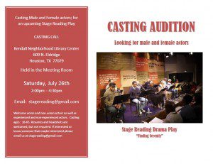 The audition will be held at the Kendall Neighborhood Library, 609 N. Eldridge, Houston, TX 77079 on Saturday, July 26 @ 2:00pm-4:30pm. If you would like more information feel free to email the casting director at stagereading@gmail.com Must live in the Houston Metropolitan Area.