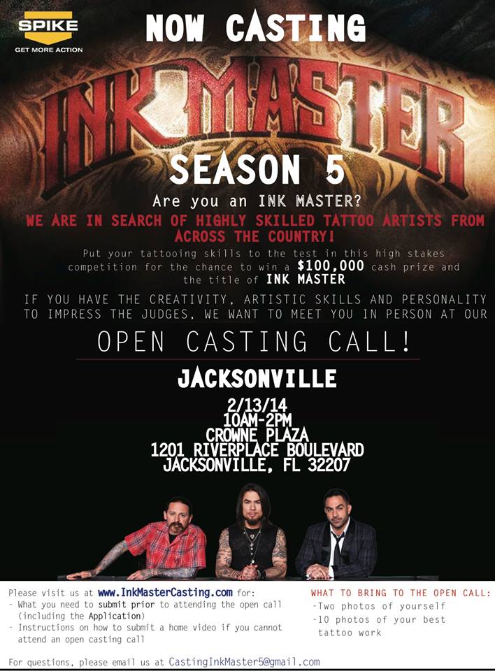 The show is searching the nation for the best tattoo artists around to compete on the show. The show is looking for dynamic, creative and skilled tattoo artists. If you think you have the skills and personality to compete on a national tattoo reality competition, come on down and meet with the show’s casting directors.
