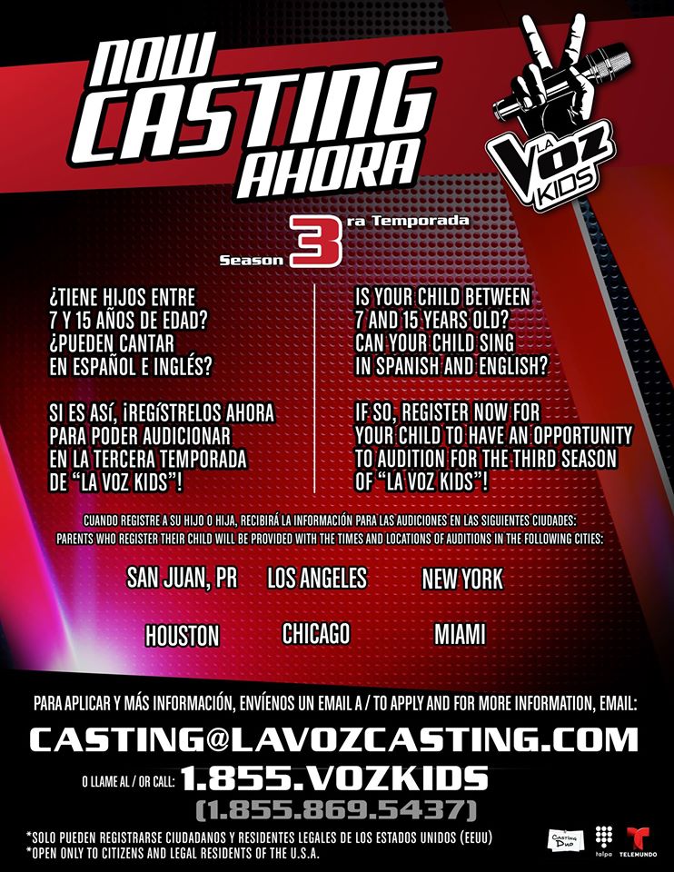 There is also another casting notice that was issued by Casting Duo. You can also see the casting call flyer below for more information about submitting your child for “La Voz Kids” – We are still searching for amazing children between the ages of 7-15 for La Voz Kids! If your child can sing in Spanish and English and is conversational in Spanish, please email us TODAY .