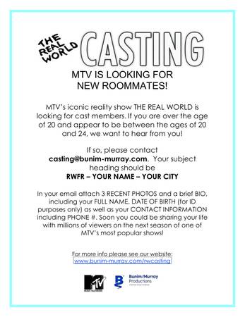 MTV’s iconic reality show THE REAL WORLD is looking for cast members. If you are over the age of 20 and appear to be between the ages of 20 and 24, we want to hear from you!