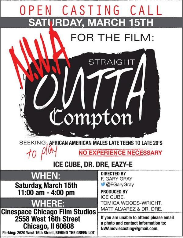 African American males in their late teens to late 20s for the roles of Ice Cube, Dr. Dre and Eazy E. No experience is necessary.