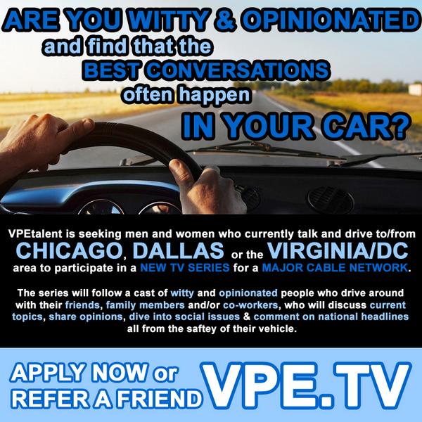 VPE Talent is currently seeking men and women who currently Talk and Drive to/from Chicago, Dallas and/or the Virginia/DC area to participate in a New TV Series for a Major Cable Network.