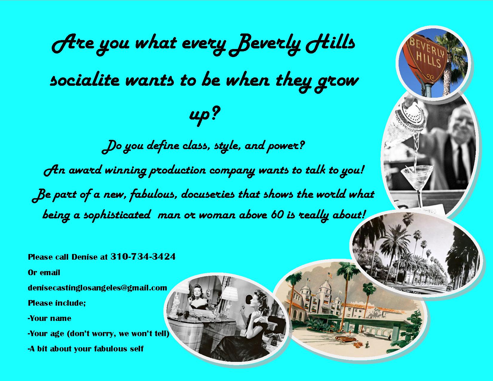 NOW CASTING classy 60+ men and women of Los Angeles socialite who wants to show the world what being fabulous is all about! Please call 310-734-3424 or email denisecastinglosangeles@gmail.com