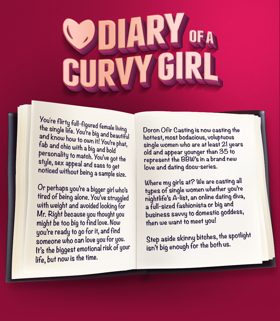 ‘Dating Diaries of Curvy Girls‘ looking for… you guessed it, curvy ladies! Are you an awesome, gorgeous, smart and sexy plus sized lady? Are you out and about on the dating scene looking for love and ready to show the world how fabulous you are and that you don’t need to be a size 2 to turn heads? Well, here’s a show you may be interested in applying for.