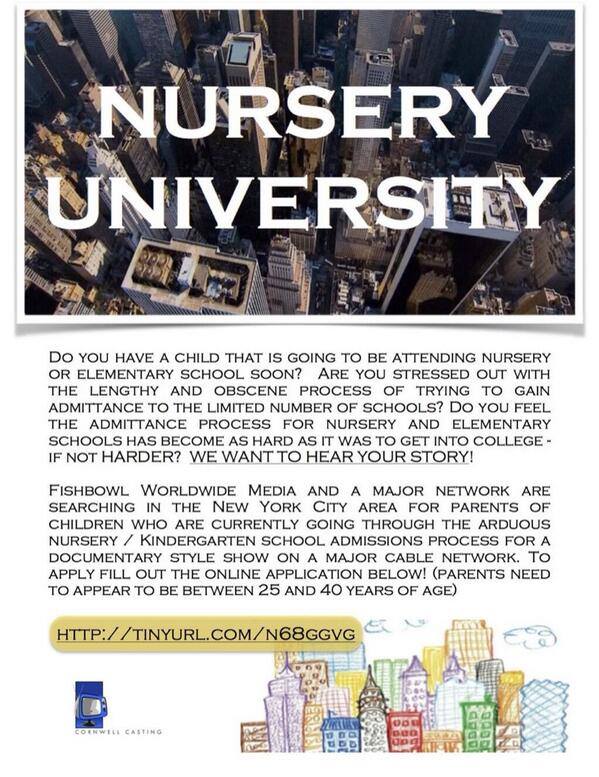 Are you a parent in the NYC area seeking admission to a private nursery or elementary school for your children? If so, we want to hear your story! Cornwell Casting and FishBowl Productions is looking for families just like YOURS for a new docu-series based on the film “Nursery University” for a major network!