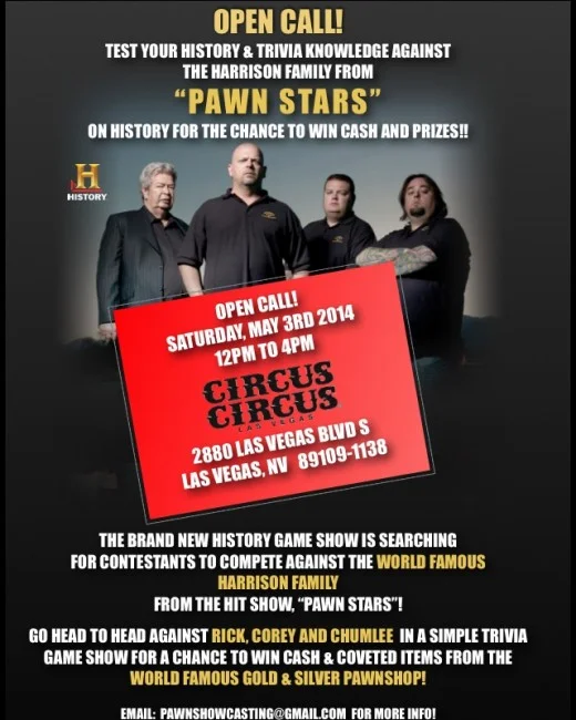 The open casting call is this coming Saturday, you can try out for a chance to test your history trivia skills. If cast, you may go up against the Pawn Stars to win some cash and prizes. Supposedly, the prizes you would be playing for are actual items from the Gold and Silver Pawn Shop.