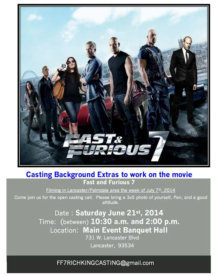 Those interested in being extras and background talent on “Fast & Furious 7” can check out the below casting call flyer for all the details. Those planning on attending need to bring a snap shot of themselves they can leave with the casting directors as well as a pen and ID.