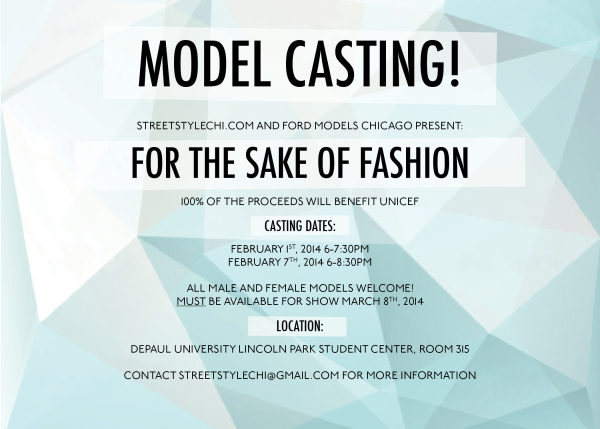 The fashion show will take place on March 8th, with 100% of the proceeds benefiting UNICEF. FORD Models will be a partner in the show, attending all castings and scouting for potential models. With this being said, all castings will be held on DePaul’s Lincoln Park campus.