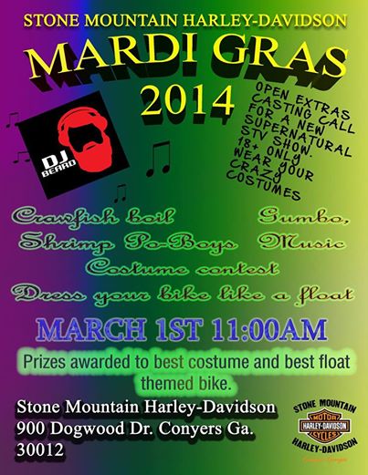 The Stone Mountain Harley dealer will be hosting a casting mardi-gras party on that date with food, music, costume contests and more. Come down to the event to meet with casting directors and enjoy the festivities.