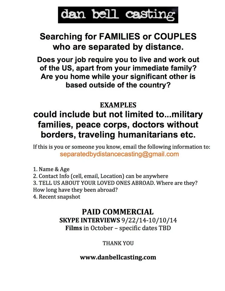 Dan Bell Casting is searching for US Military families with children and whose mother or father is currently deployed. The commercial will be filming sometime this month and auditions / interviews will be done over Skype this week and next week.