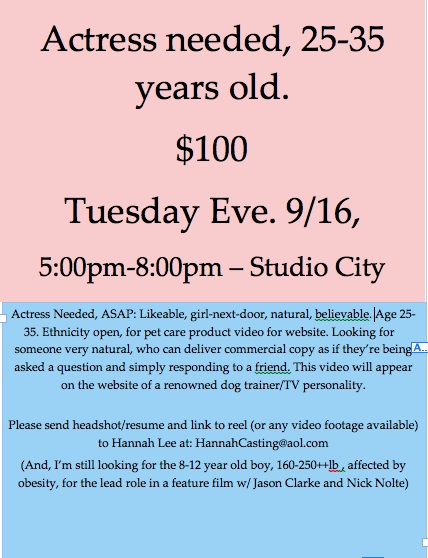 3. PLEASE STATE THAT YOU ARE AVAILABLE TO WORK ON TUESDAY 9/16/14 from 5:00pm-8:00pm in Studio City in the email. (I need to see you you write this in the email because lots of actors just blindly submit without reading the entire post.)