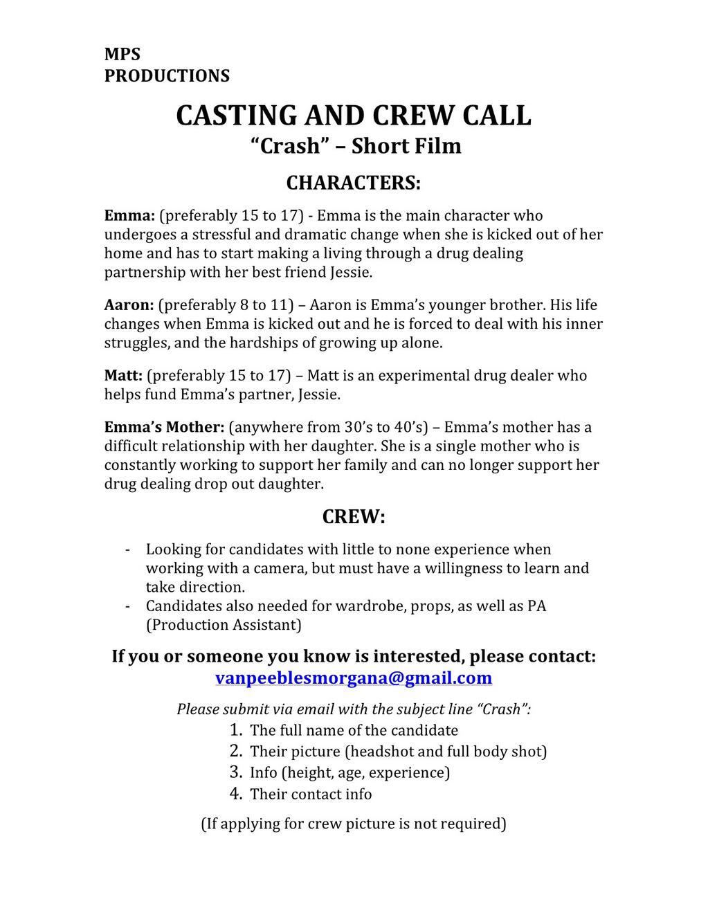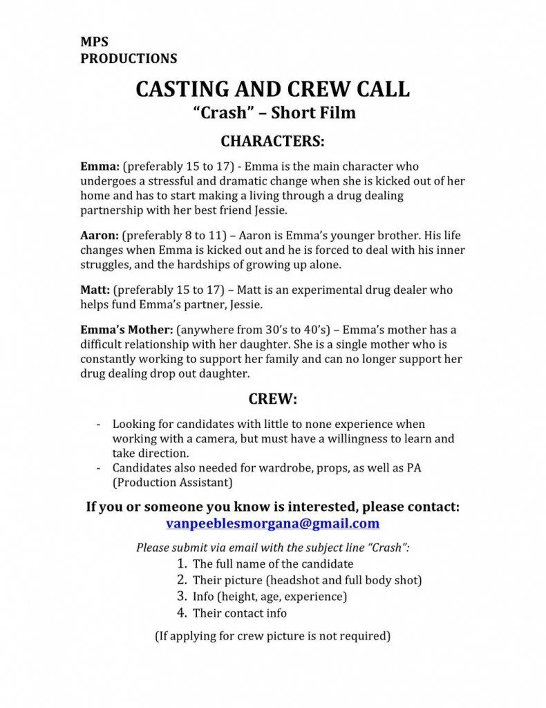 Short film in the L.A. area is seeking cast and crew. Please the the below breakdowns for more information on how to apply.