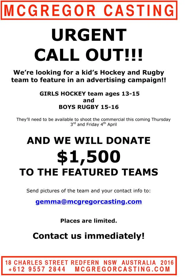 McGregor casting in Sydney is in need of some kids hockey and rugby teams for an advertising campaign they will be filming.
