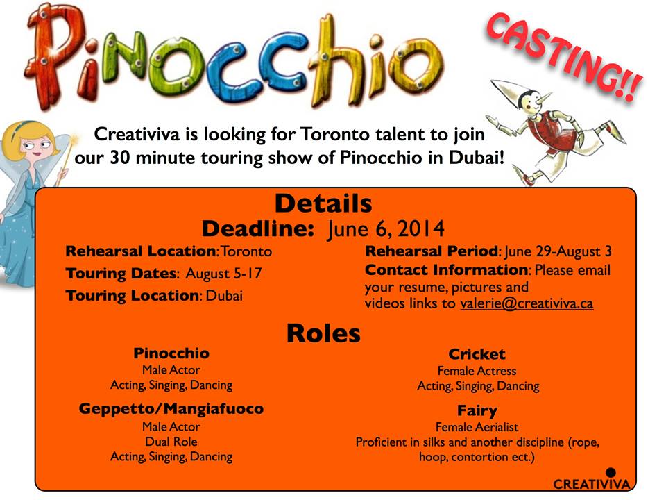 Creativiva is looking for talented artists to be a part of our 30-minute touring production of Pinocchio.
