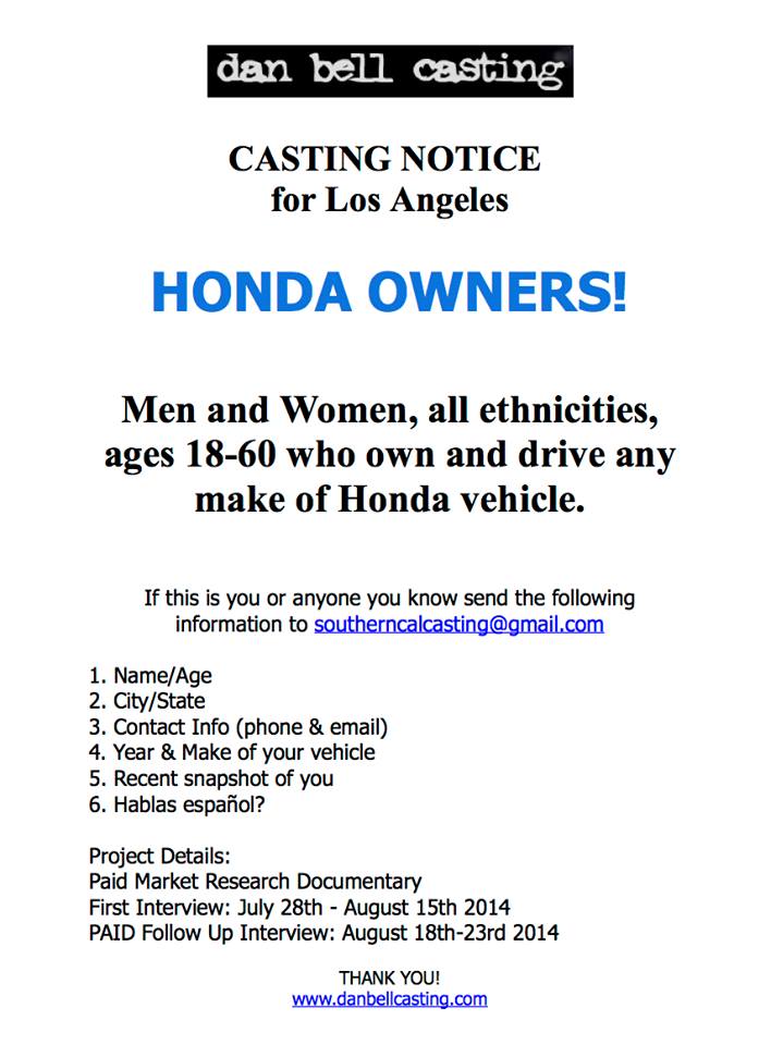 If you currently own or drive any model Honda, and live in the L.A. area, casting directors want to hear from you.
