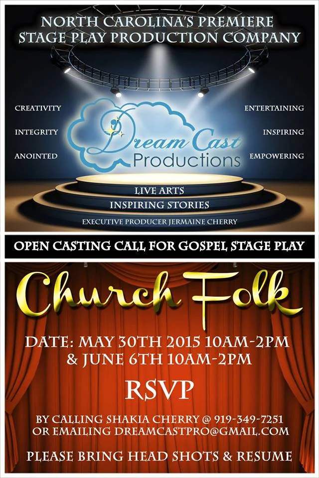 Gospel stage play “Church Folk” – Auditions will be held on May 30th and June 1st in Raleigh. Audition slots will be by appontment only and all talent interested must follow the instructions on the below flyer to request RSVP their time slot. Actors / singers interested must bring a headshot and resume to the call.