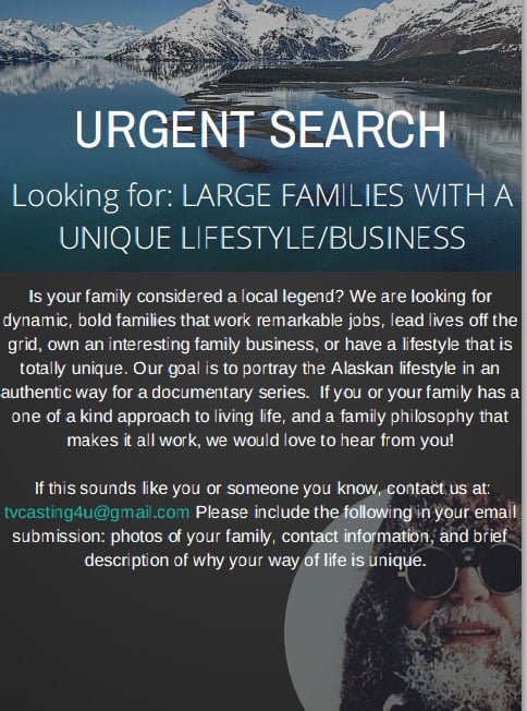 Now casting in Alaska – LARGE FAMILIES WITH A UNIQUE BUSINESS/ LIFESTYLE