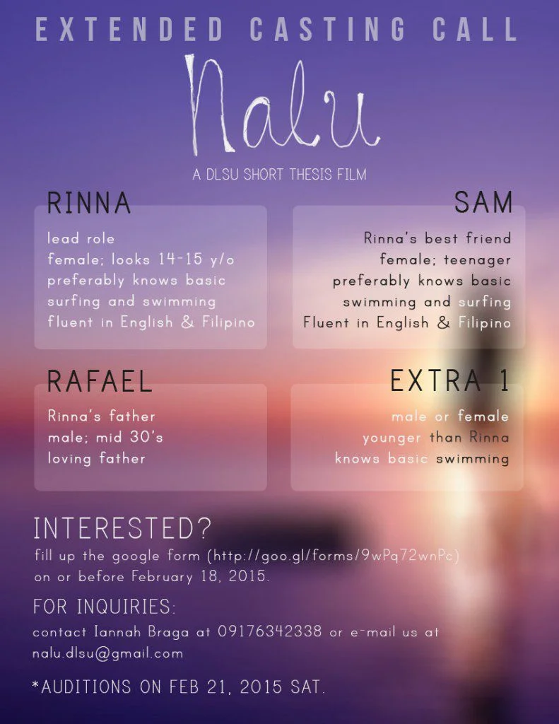 For inquiries, contact Iannah Braga at 09176342338 or e-mail us at nalu.dlsu@gmail.com