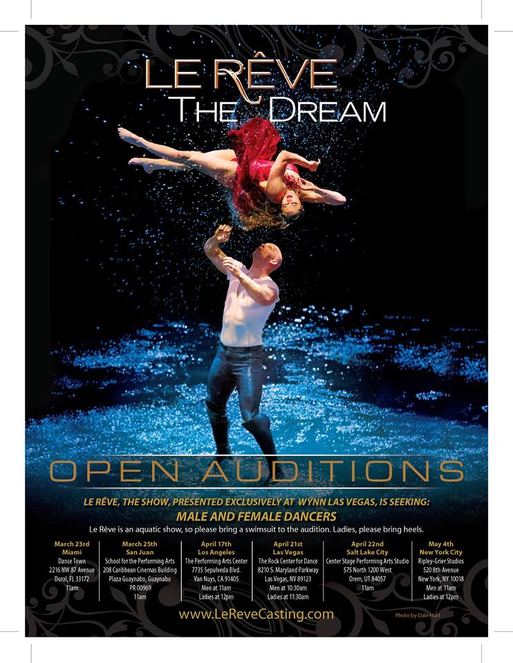 Le Reve – The Dream is currently seeking Male and Female Technically -Trained Dancers and Ballroom Dancers. Le Rêve is a breathtaking aquatic spectacle created by Franco Dragone and presented exclusively at Wynn Las Vegas. The show will be holding auditions in multiple cities nationwide which include Miami, Las Vegas, Los Angeles, New York, Saltlake City, and San Juan Puerto Rico.