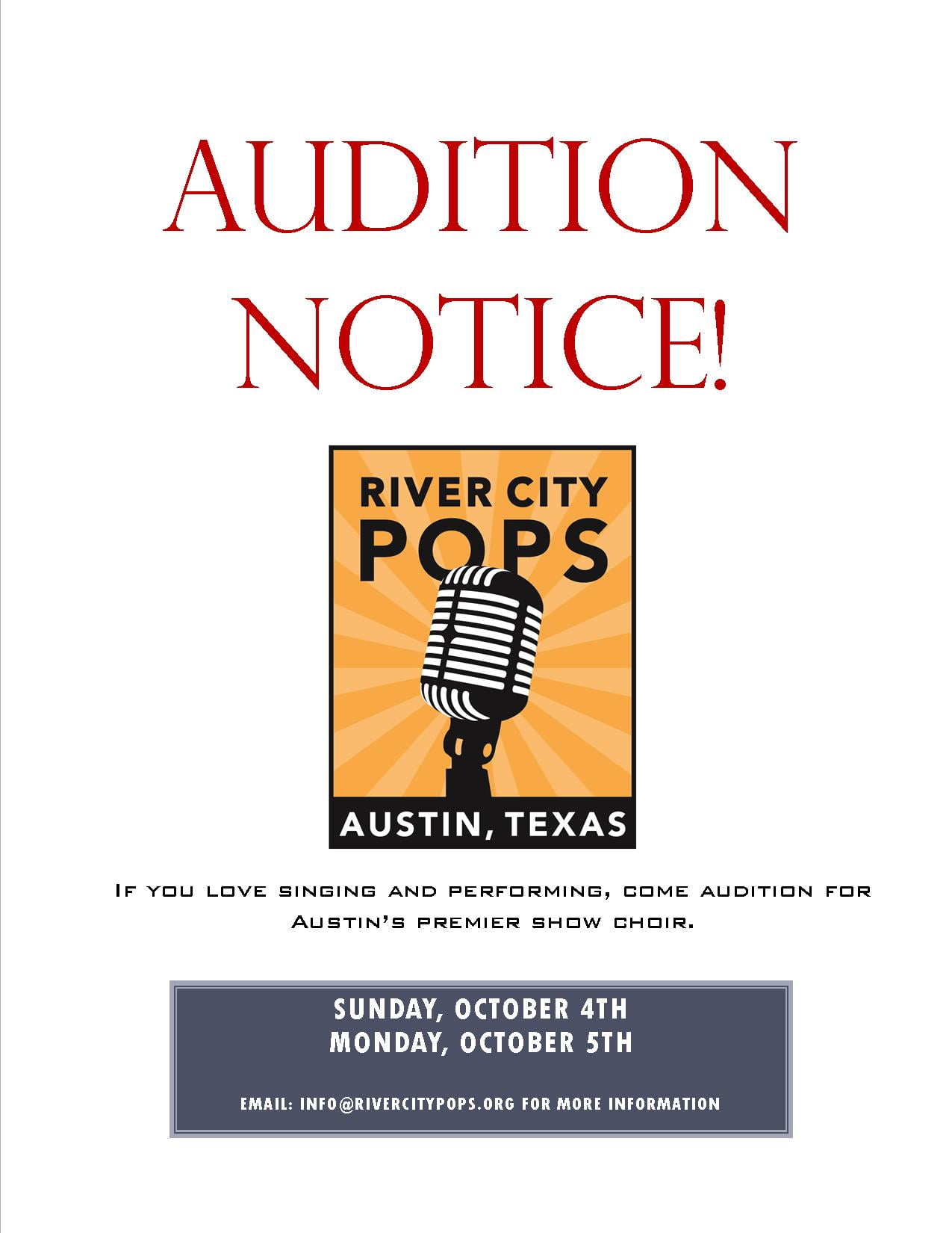 Please email info@rivercitypops.org to schedule your audition time and visit us at http://rivercitypops.org/.