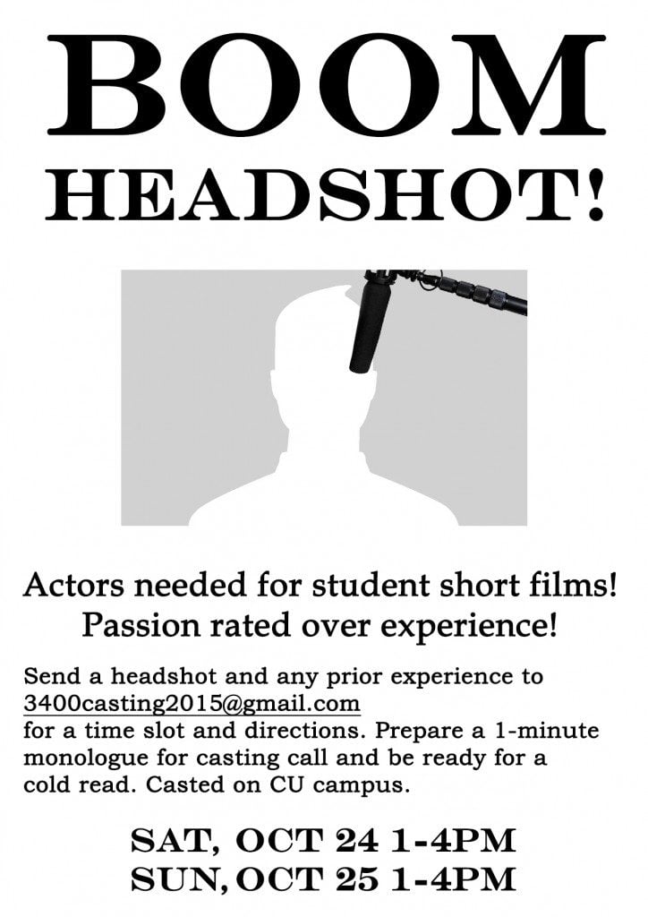 Casting call is Oct 24 and Oct 25 1-4pm on CU Boulder campus. We are looking for actors of all types to present a 1-min long monologue in front of the whole class. Each student will have a different film so everyone will be looking for something different. If interested, please email a headshot and any prior experience to 3400casting2015@gmail.com to get the location details and reserve a time slot. Be prepared to do a cold read.