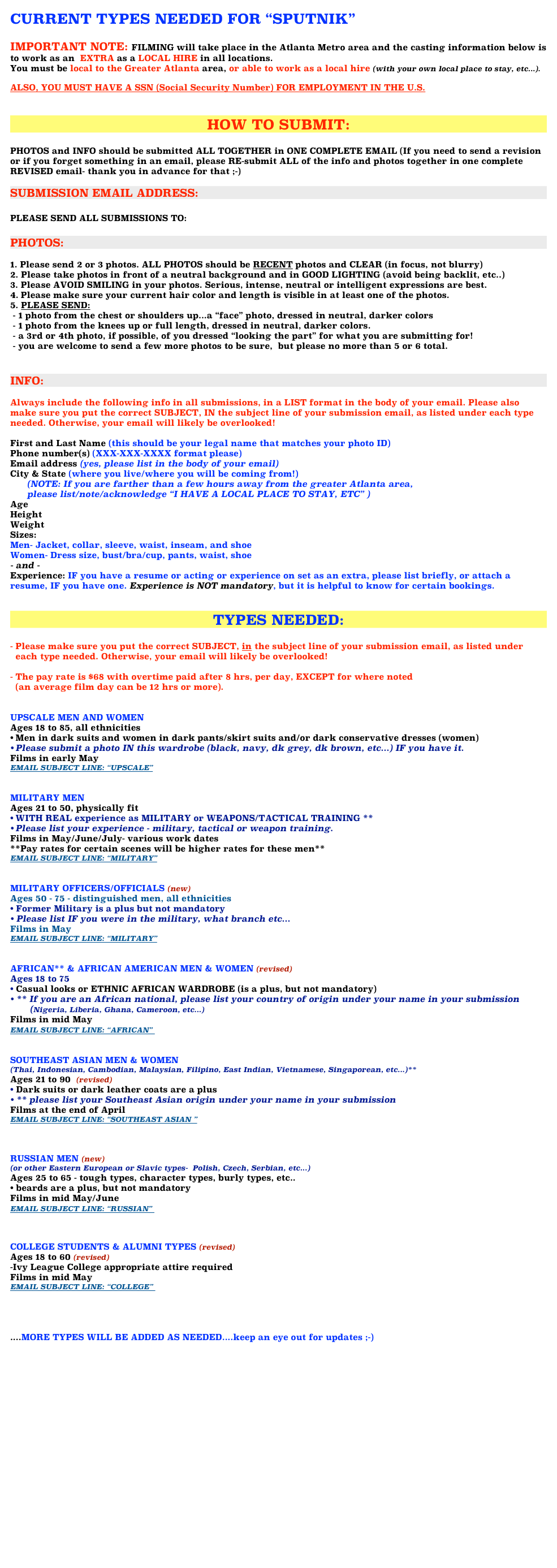 Please see all the role descriptions below. Talent interested in applying for the roles must be local to the Atlanta area (no travel expenses are being paid) and send in their submissions to sputnikextras@gmail.com. Please see the updated list of roles avail;able below and apply with the appropriate subject line for the role.