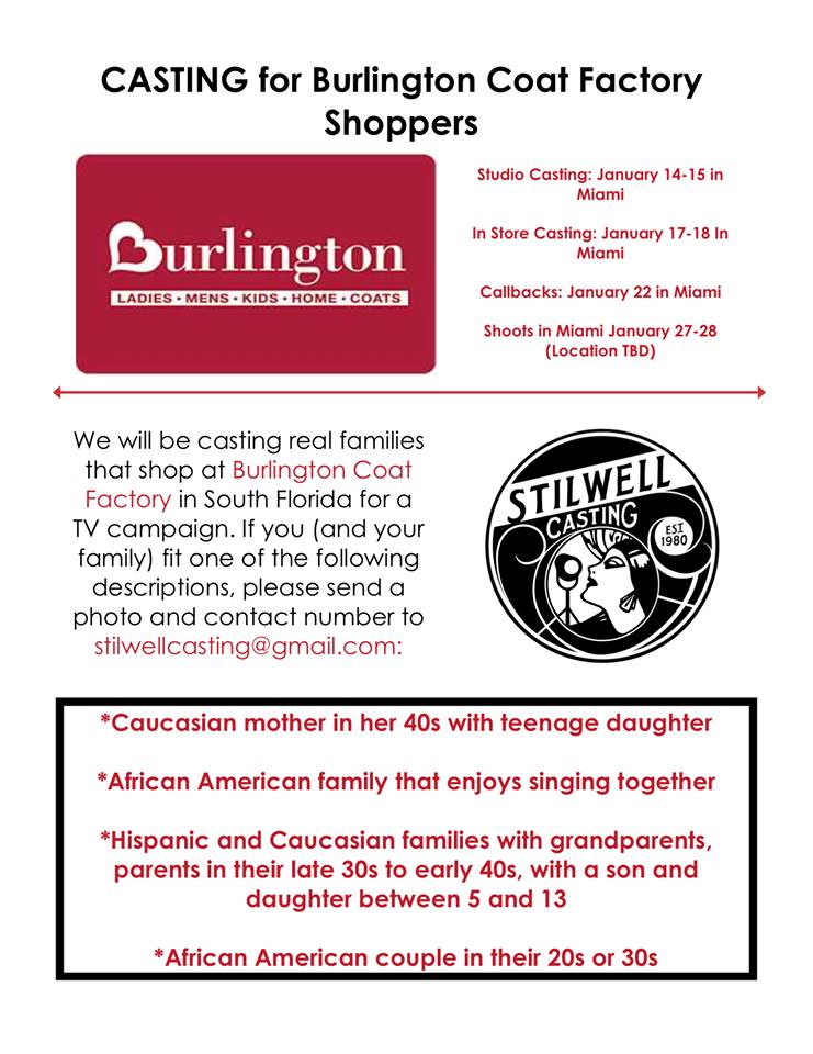 Miami area families have a chance to get into a TV commercial for a national clothing chain. The Burlington Coat Factory will be filming a TV commercial in the Miami area and are seeking to cast some REAL families in South Florida. Stilwell casting will be coming to South Florida in about a week to hold auditions for roles available in the project.